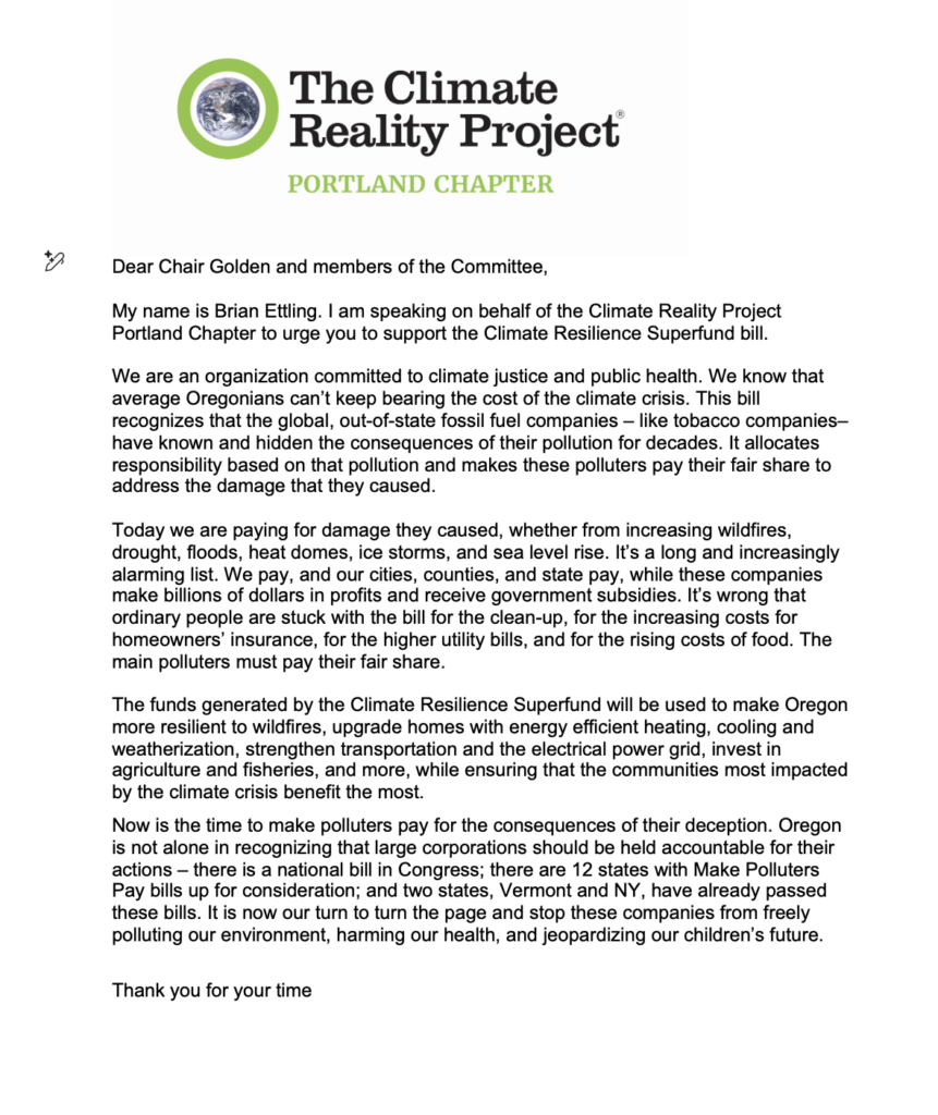 Nearly every Oregon climate and environmental group that I volunteered with or had partnered in the past made it their top priority for the Oregon Legislature to try to pass this bill for the Oregon 2026 Legislative session. These groups included OLCV, MCAT, Building Resilience Coalition, 350PDX, Third Act Oregon, Oregon Environmental Council, and others that made up the Make Polluters Pay Coalition.