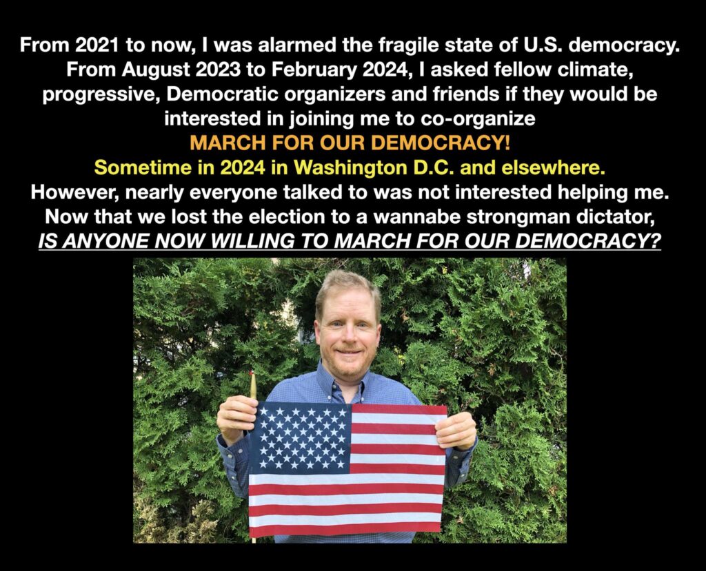 After January 6th, I switched from being strictly a climate organizer to a climate and democracy organizer. To document my lifelong shift in thinking, I wrote an 8-part blog from October to December 2023, For Climate Action, let’s protect our democracy.