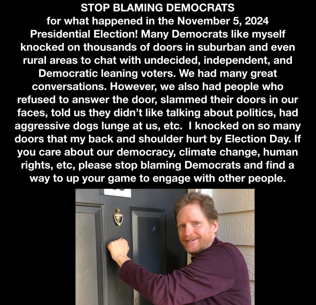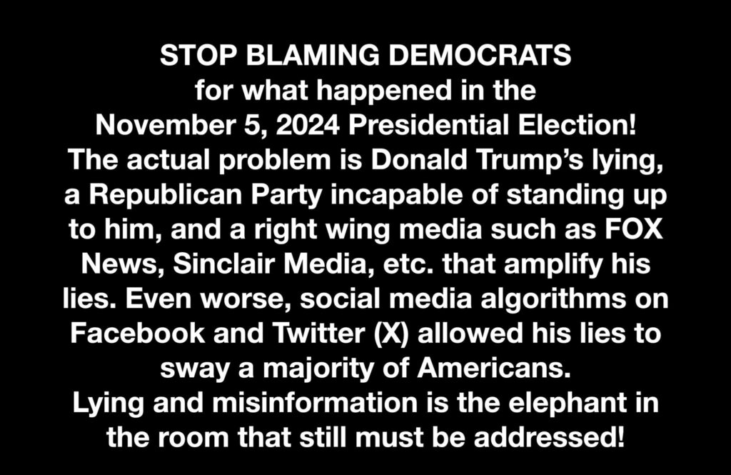 This post stirred up a hornet’s nest for friends and followers of mine on social media who wanted to blame the Democratic Party for the loss. I held my ground. For friends that wanted to blame the Democrats, I shared this quote with them from Democratic elections lawyer Marc E. Elias who said it best on Twitter: “If you are a Democrat who is spending time attacking Kamala Harris or her campaign rather than focusing on the fight ahead, you aren’t helping anyone.”
