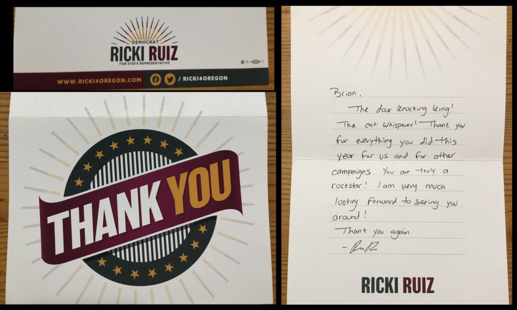 Just two weeks later, I received a thank you card from Oregon Representative Ricki Ruiz. In his handwritten card, he wrote: