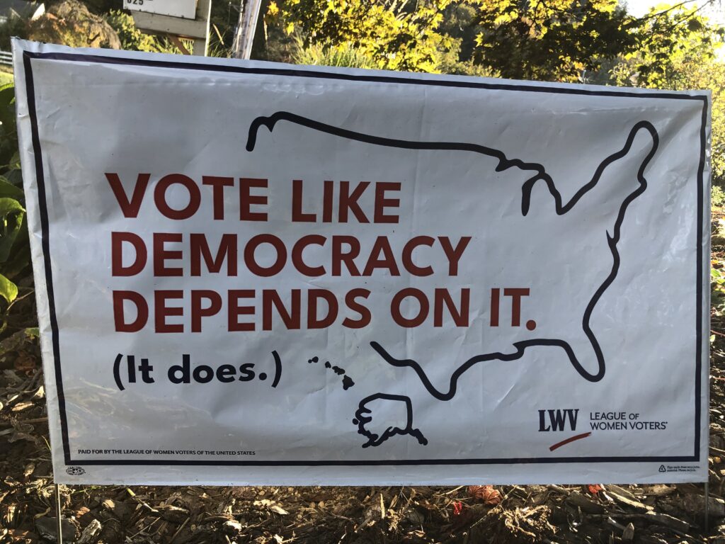 I took a photo of that sign to post on my social media with the comment, “For our #democracy, a sign I recently saw while knocking on doors for Democratic candidates in Gresham, OR. All of us need to step up our game to speak out, have tough conversations with friends and family, make phone calls, knock on doors, support Democratic candidates, and #vote if we want to keep our freedoms and standard of living.”