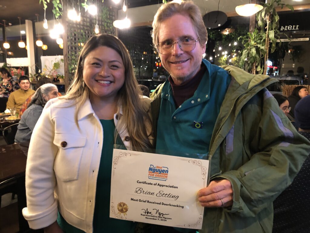 Several local elected leaders came to speak to congratulate Hoa at this party, including my Oregon Senator Kayse Jama, Oregon Senator Khanh Pham, founder of East County Rising and Gresham City Councilor Eddy Morales. Aimee then had some remarks about the significance of Hoa’s win in this purplish district that Oregon Republicans targeted to try to win. She then had awards to volunteers who worked the hardest to help Hoa win.